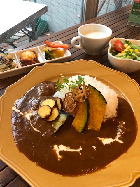 コクのある特製カレーに、素揚げした季節の揚げ野菜をのせました♪