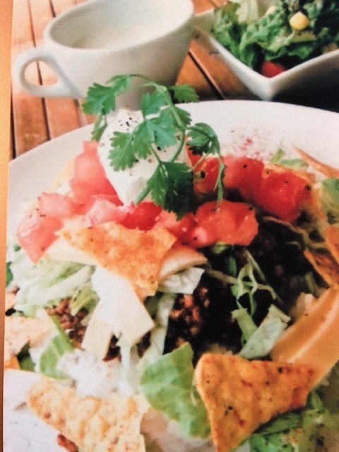 ライスの上に、ほんのりスパイシーなひき肉、レタス、チーズ、トマト、サワークリーム、トルティーヤチップスをのせました。よく混ぜてどうぞ♪